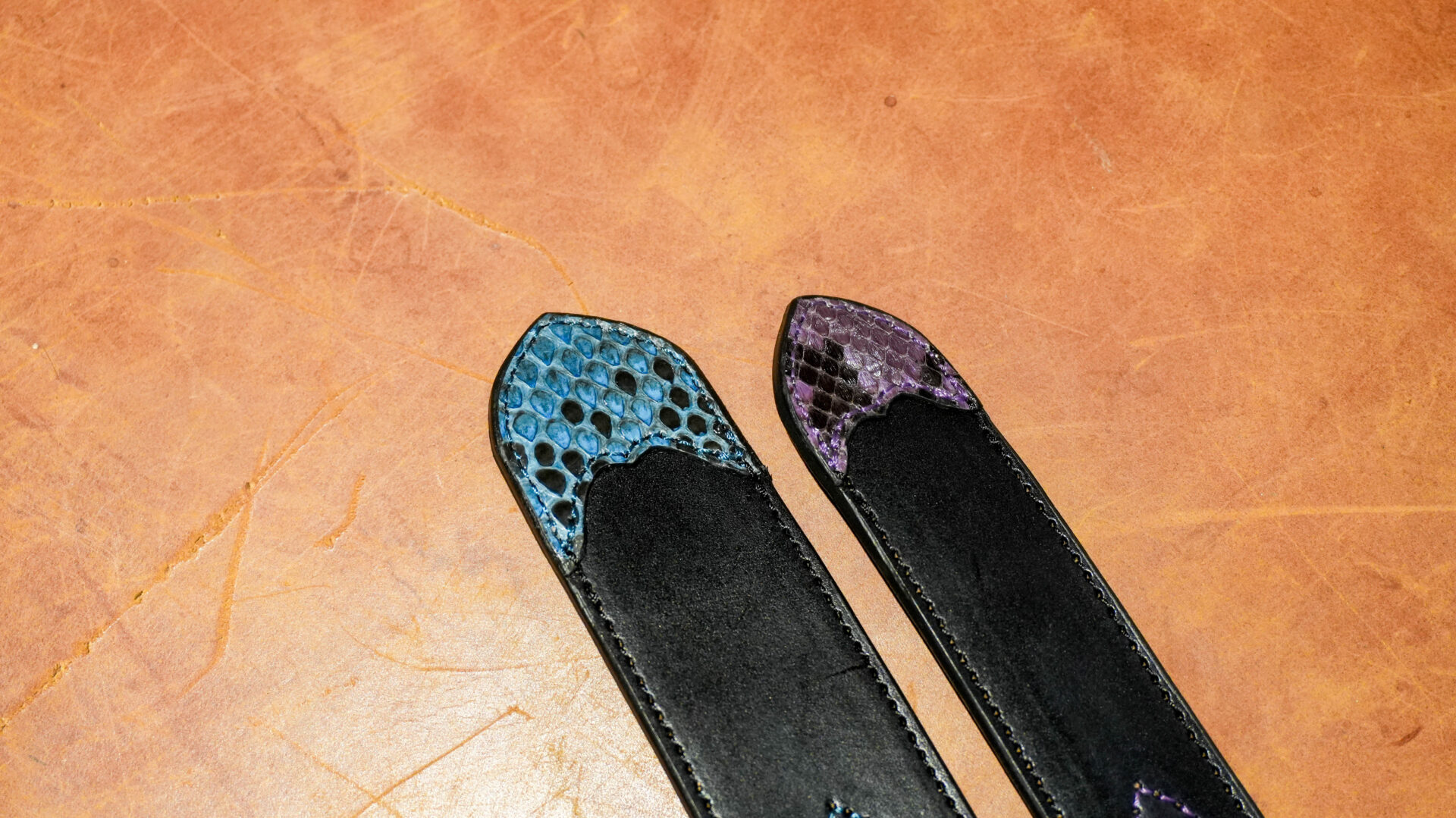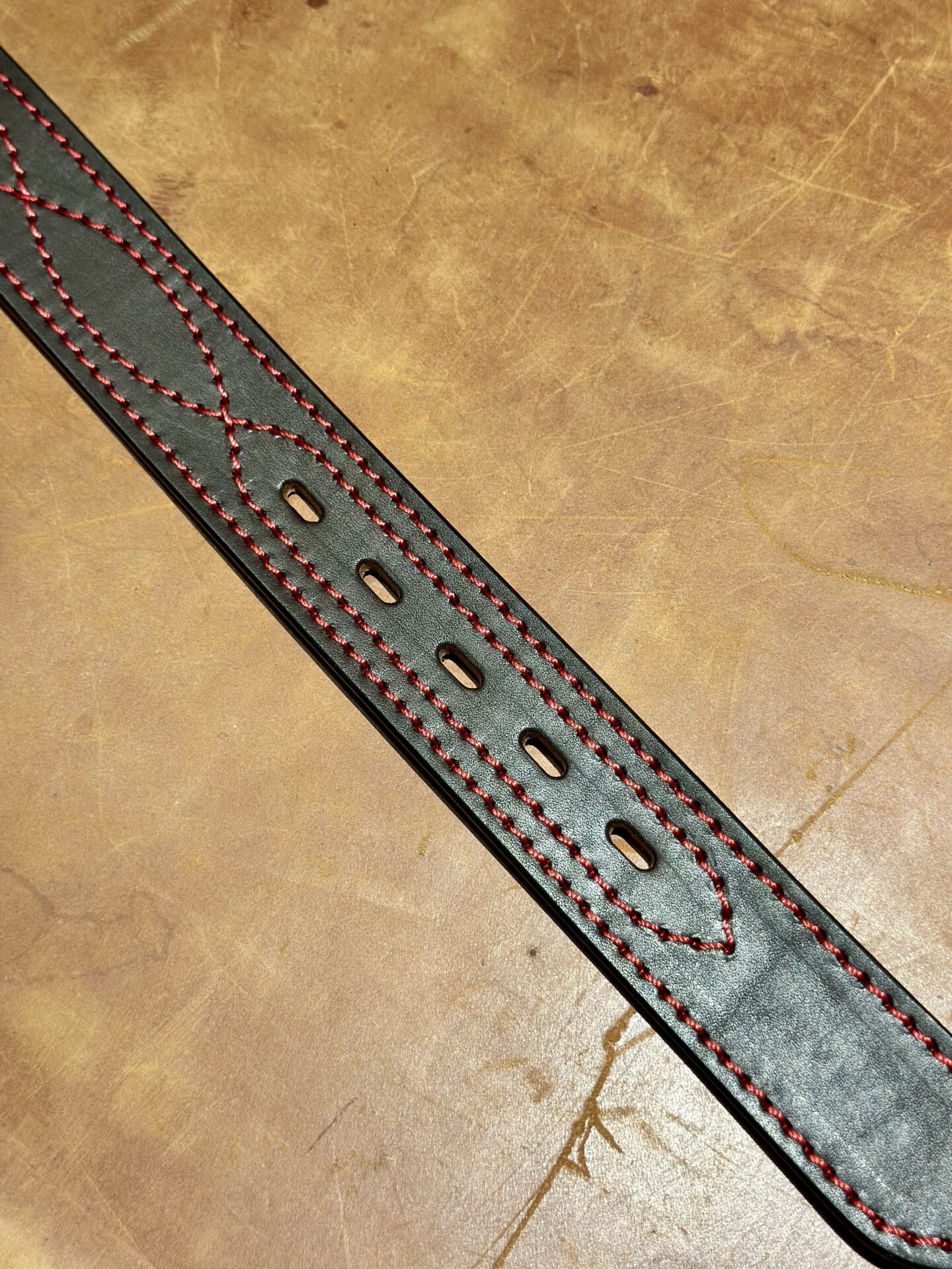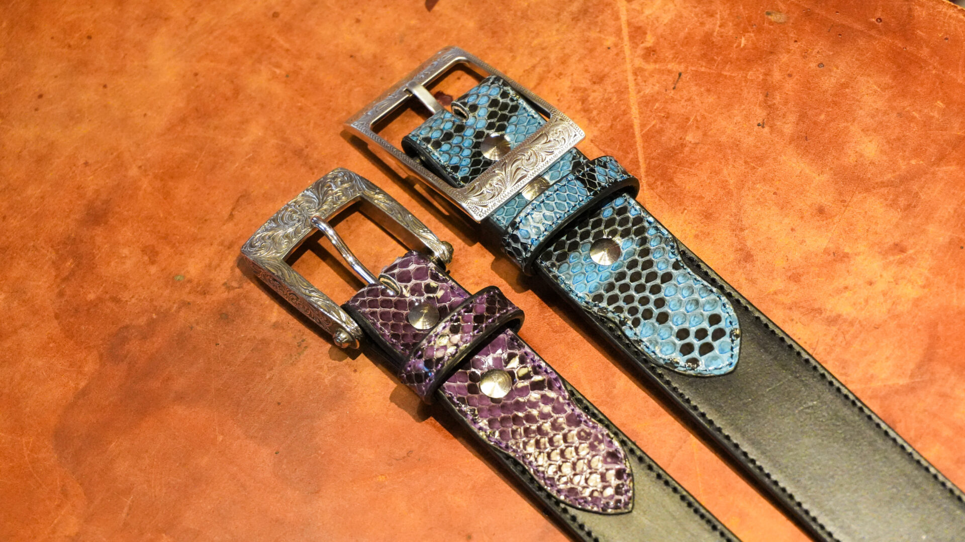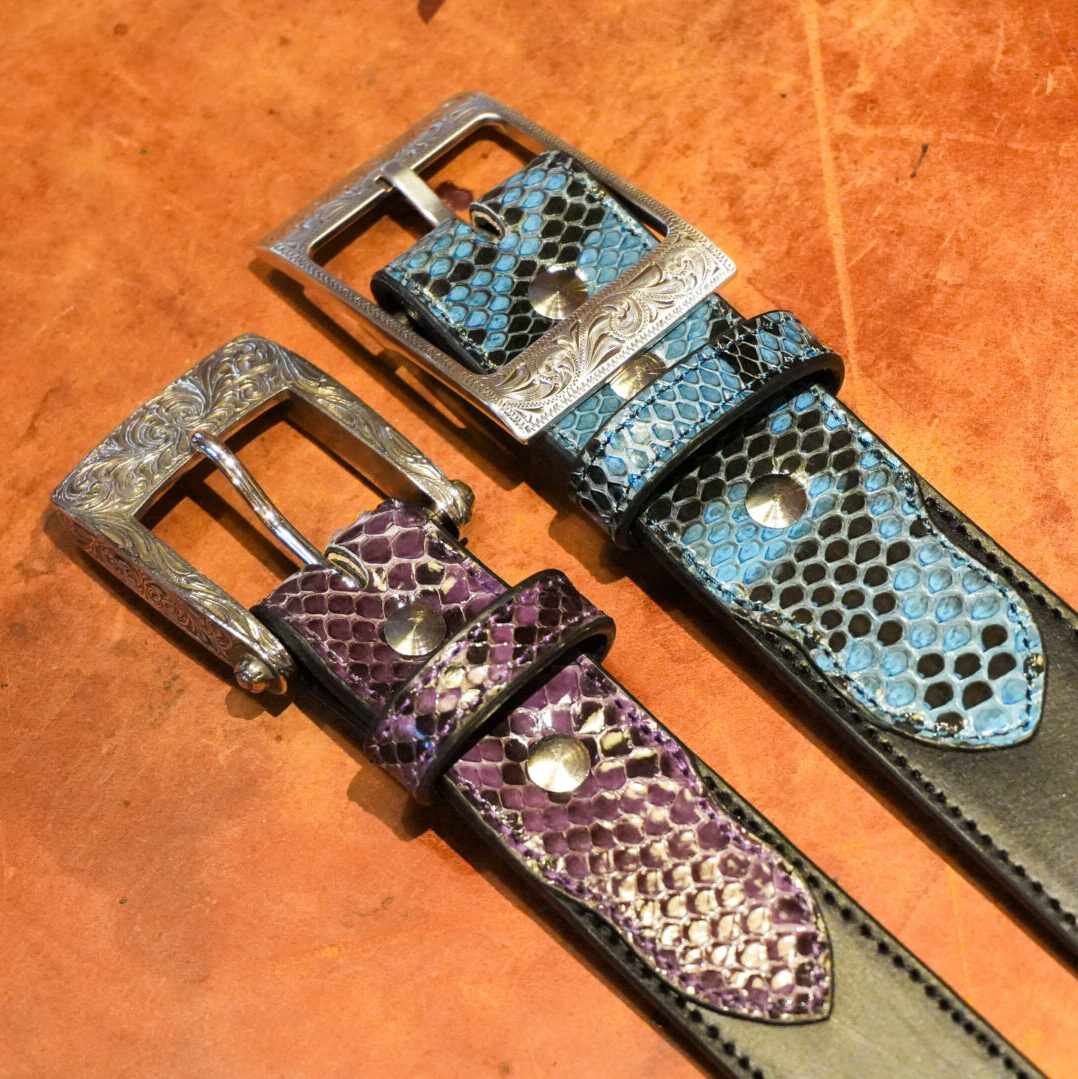 バックル周りと剣先に蛇革を貼ったワイルドな仕上がり。ベルト穴の周りには螺旋状にステッチを施しています。色は蛇革と合わせています。画像掲載していませんが裏面にはレーザー名入れも実施。特別な贈り物にお選びいただいた2本のベルトでした。
