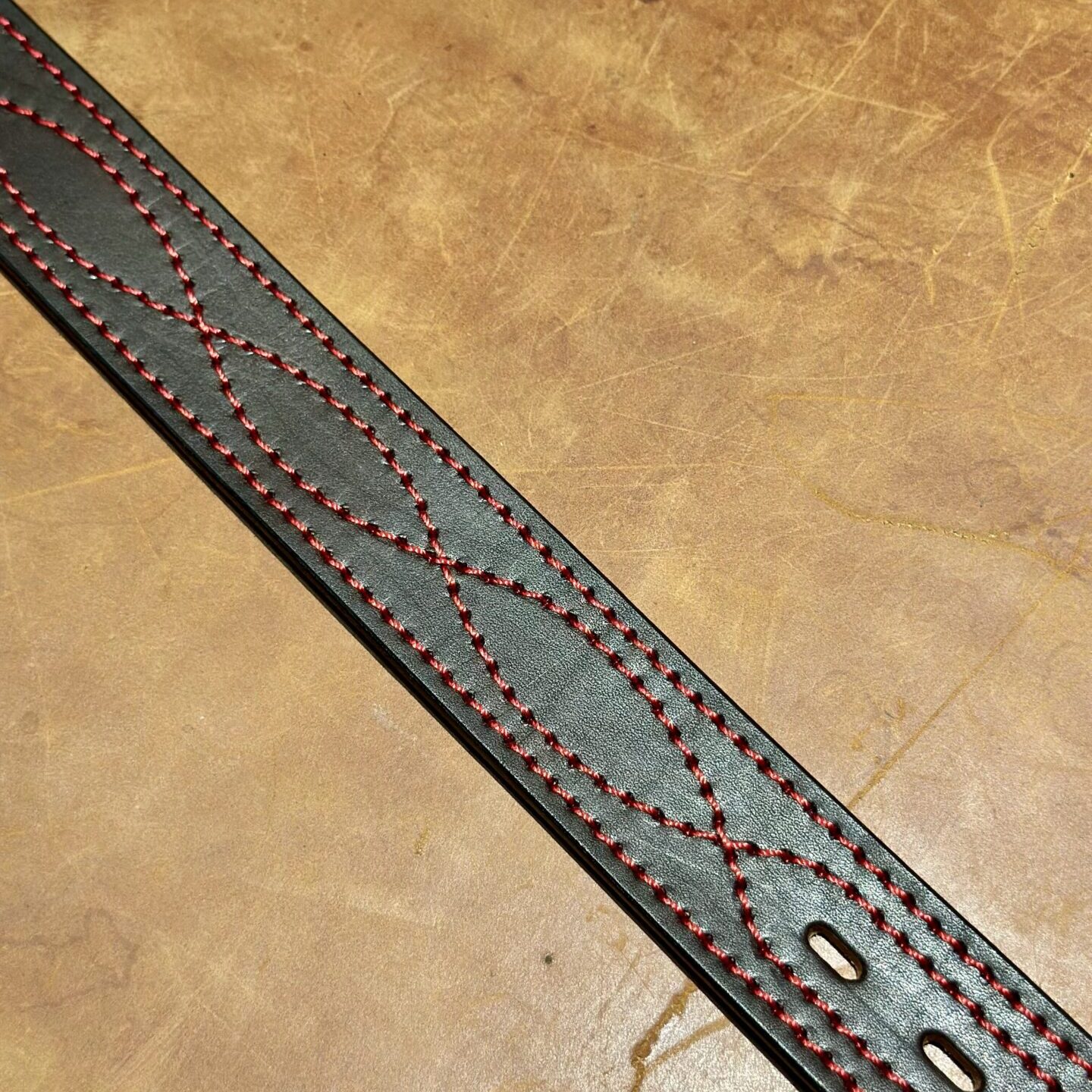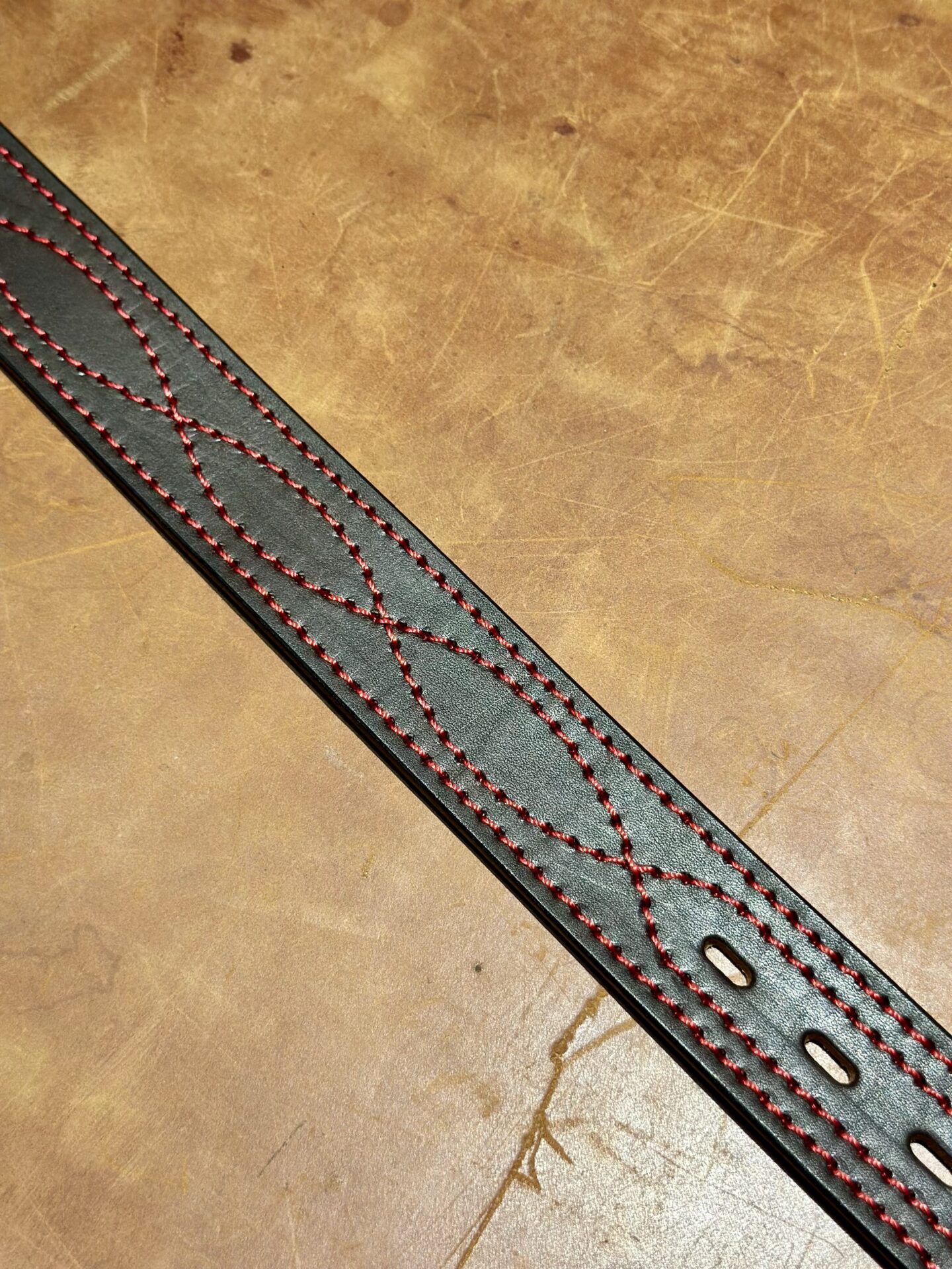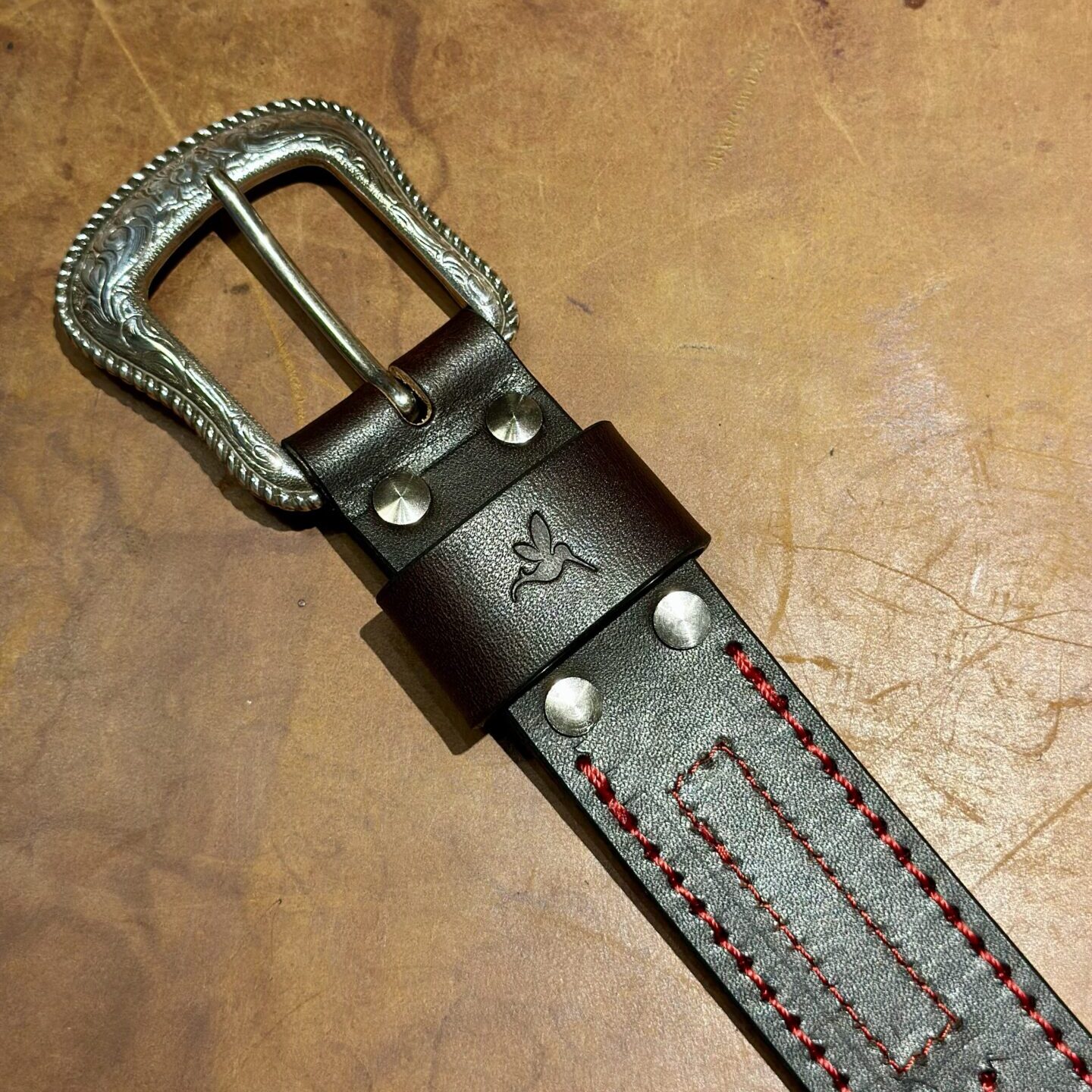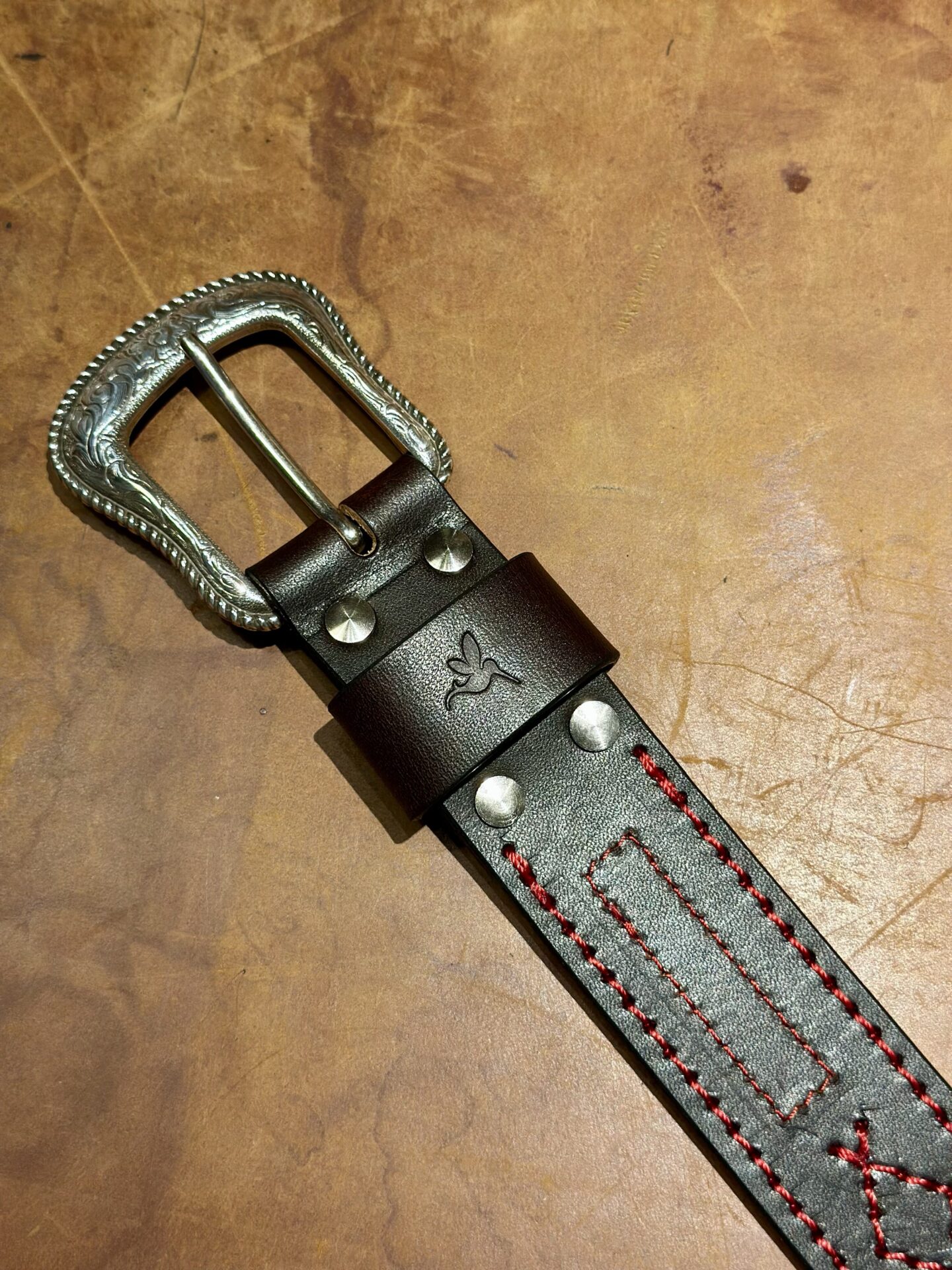 ブラックの本革に赤色のステッチが映える一本。ボディ部分はクロス模様でベルト穴は周りを囲むようなデザインに仕上げ。ベルトループのハチドリ刻印もポイント。