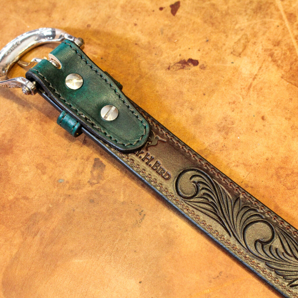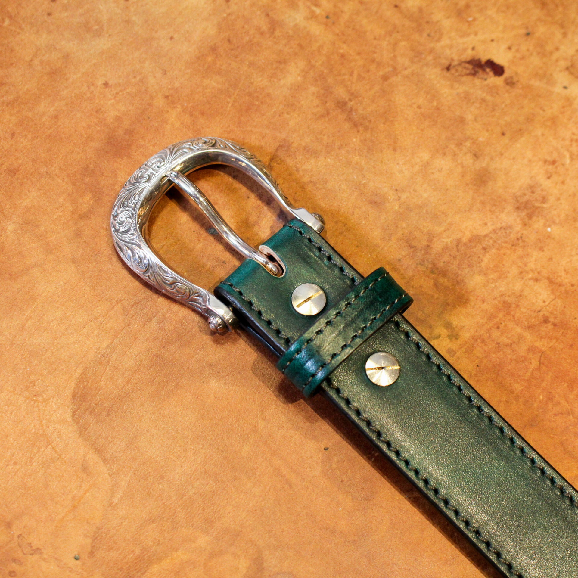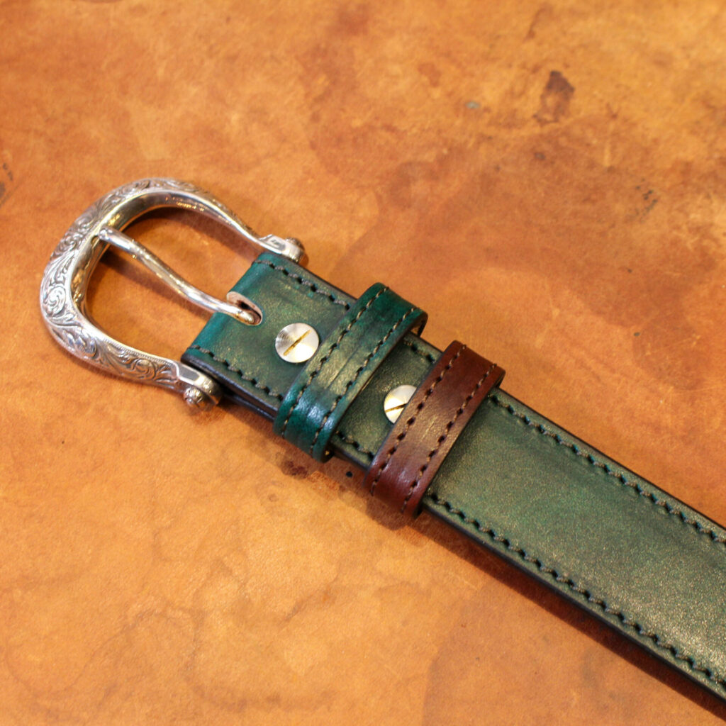 片面はムラ感のあるアンティーク染めのグリーン、もう片面は手彫りのフリーカット(ブラウン)の両面仕上げ。バックルはネジ式なのでお客様の手でリバーシブルに変身できます。